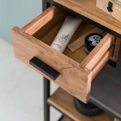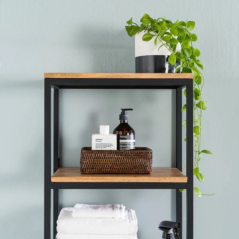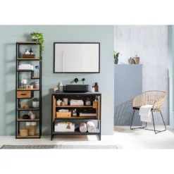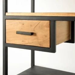 - Étagères : acacia / imitation béton