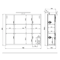 - – Compartiments derrière les portes de droite et de gauche (sans les tablettes en verre) : 16,7 x 61,6 x 14 cm