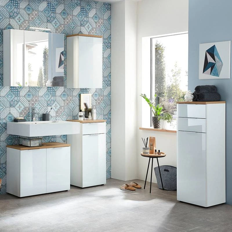 - Contenu de la livraison : 1 armoire de toilette, 1 meuble sous lavabo, 1 meuble haut,1 meuble bas et 1 armoire de salle de bain, sans accessoires