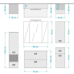 - Armoire de toilette (LxHxP) : 80 x 70 x 16 cm