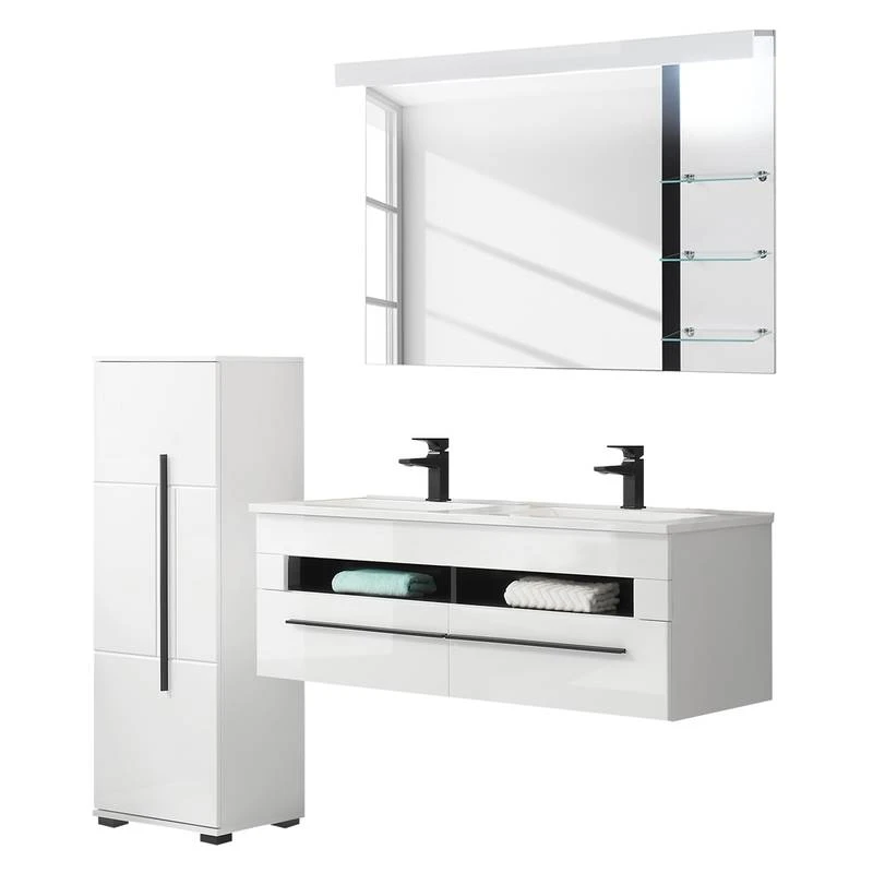 - Contenu de la livraison : Salle de bain comprenant 1 meuble double avec 2 vasques en fonte minérale, 1 armoire de salle de bain (avec charnière à gauche) et 1 miroir avec éclairage LED