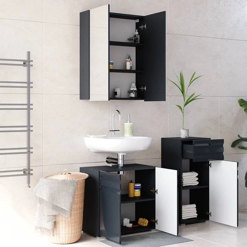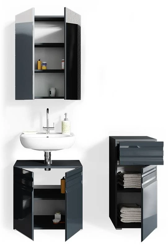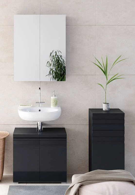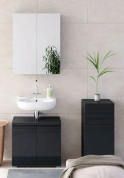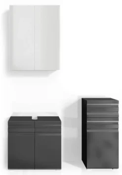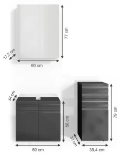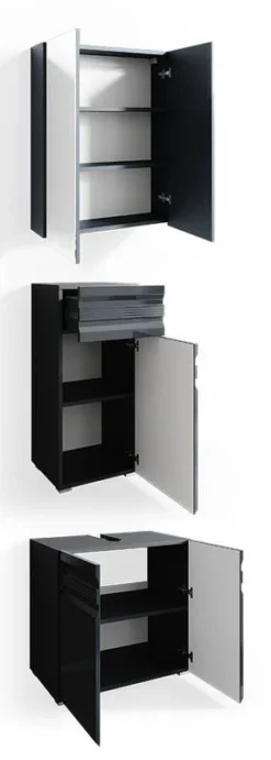 - Contenu de la livraison : Set 2 • 1x meuble sous-vasque • 1x armoire de toilette • 1x chiffonnier Décoration non incluse
