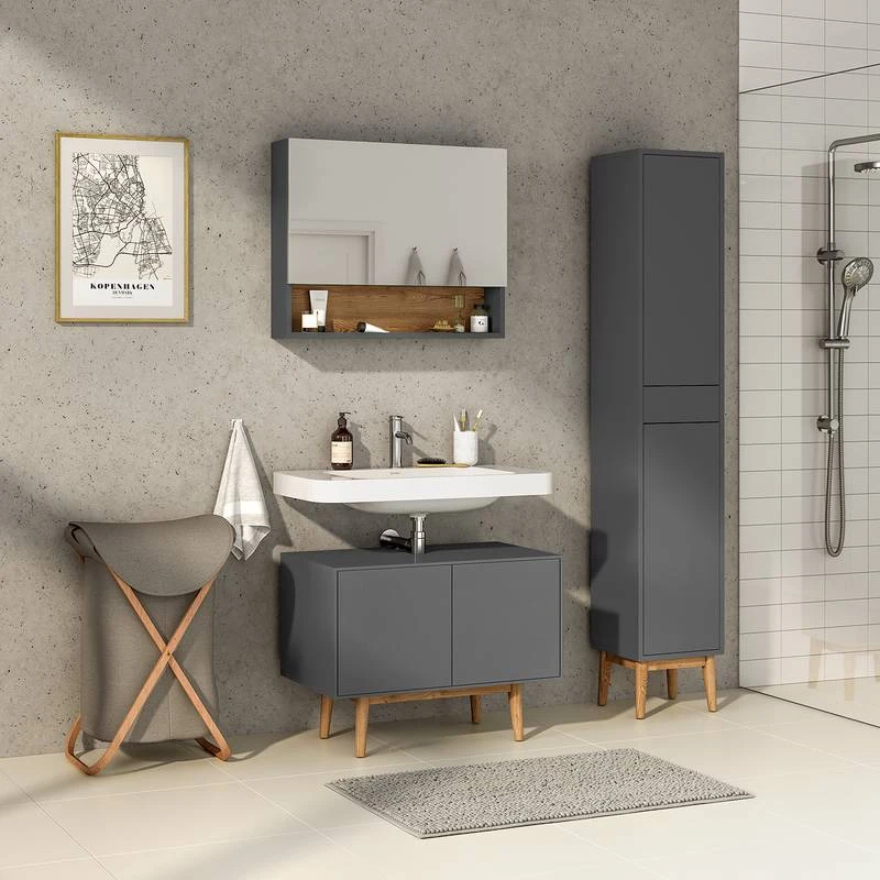 - Contenu de la livraison : Ensemble de salle de bain comprenant 1 meuble sous lavabo, 1 colonne de salle de bain et 1 armoire de toilette avec porte relevable