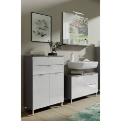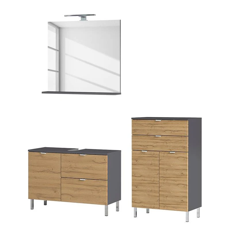 - Contenu de la livraison : Salle de bain composée de 1 meuble sous vasque, 1 miroir avec éclairage inclus et 1 colonne de salle de bain, sans accessoires