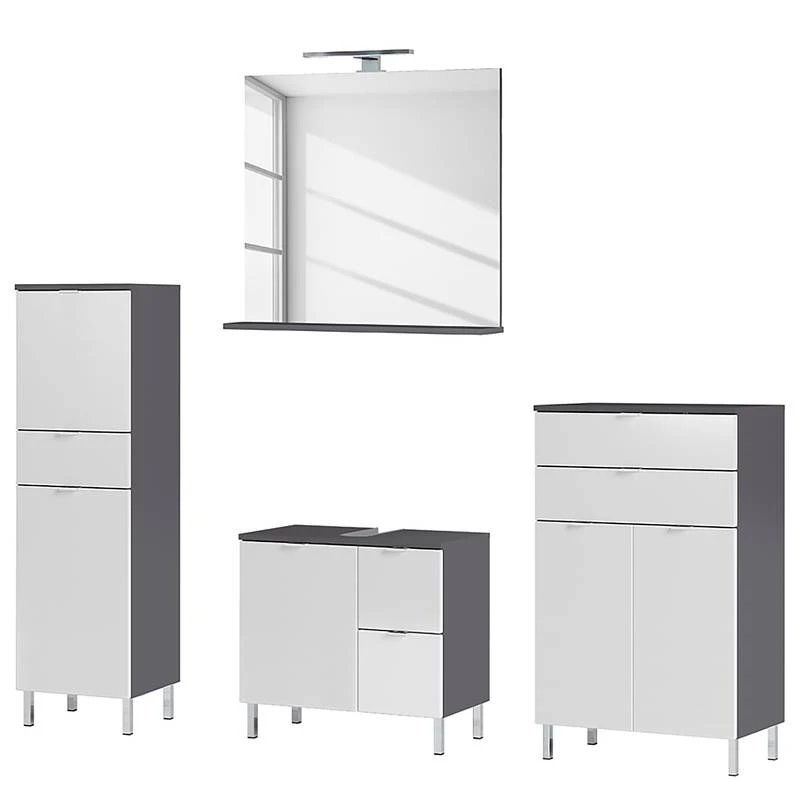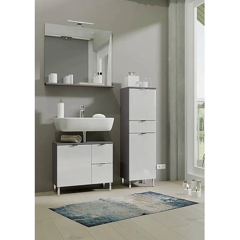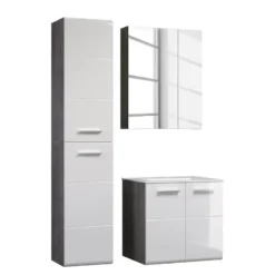 - Contenu de la livraison : Salle de bain composée de 1 meuble sous vasque, 1 miroir avec éclairage inclus et 2 colonnes de salle de bain, sans accessoires
