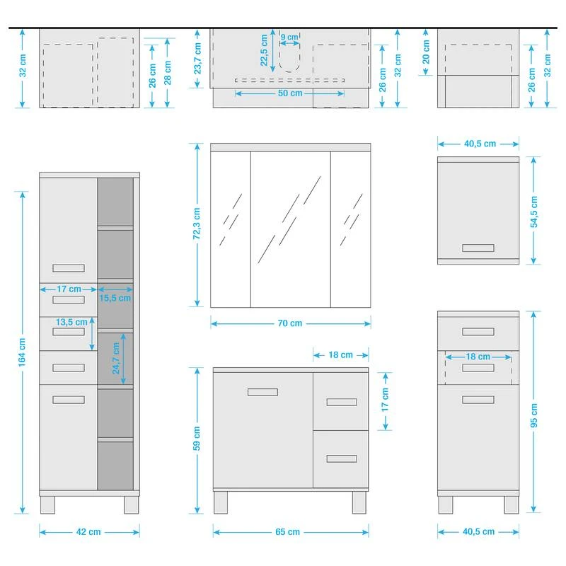 - Armoire de toilette (LxHxP) : 70,5 x 72,3 x 23,7 cm