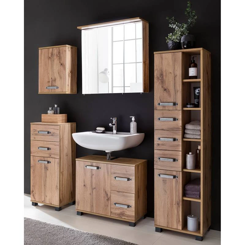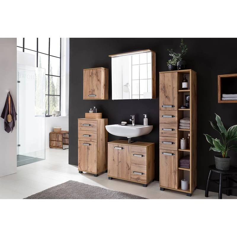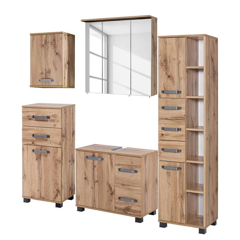 - Contenu de la livraison : Ensemble de salle de bain comprenant 1 meuble sous lavabo, 1 colonne de salle de bain, 1 meuble bas, 1 meuble haut et 1 armoire de toilette avec éclairage