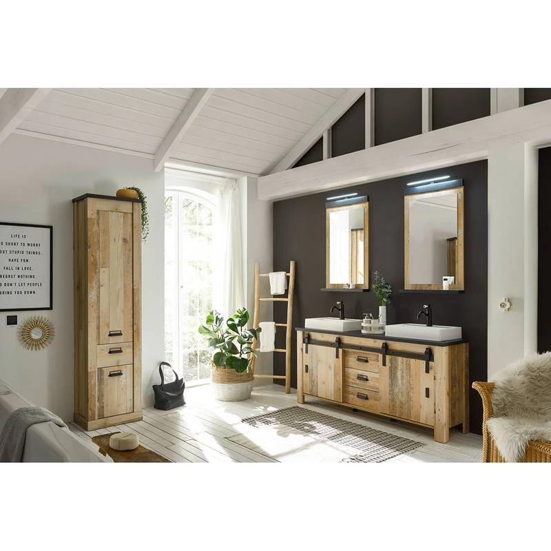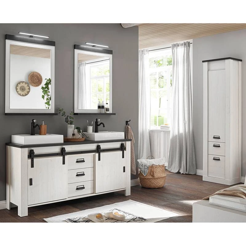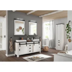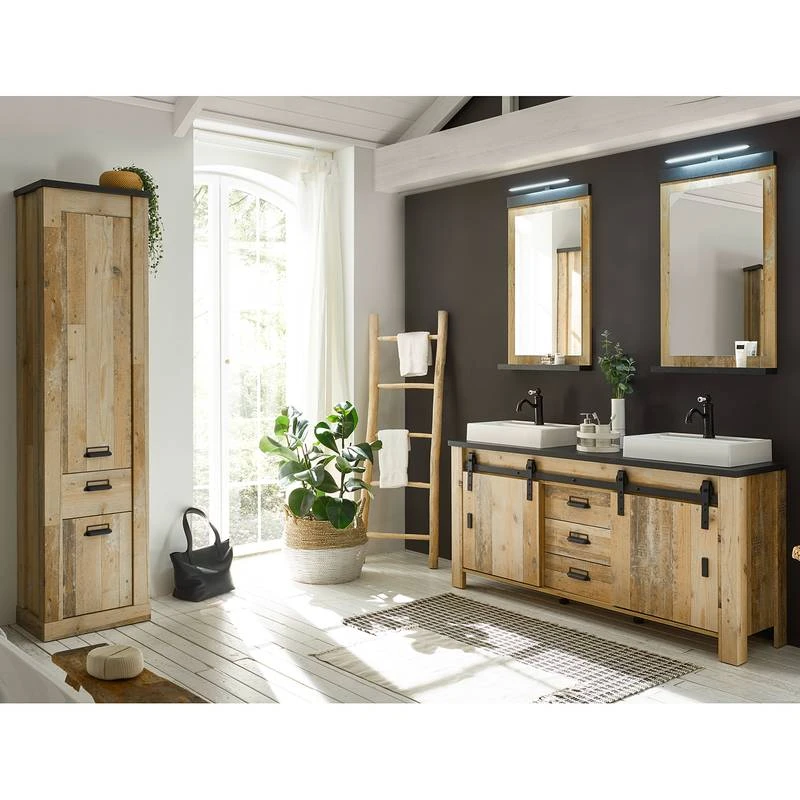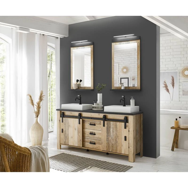 - Contenu de la livraison : Salle de bain comprenant 2 miroirs avec éclairage, 1 armoire, 1 meuble avec vasque en fonte minérale, sans accessoires