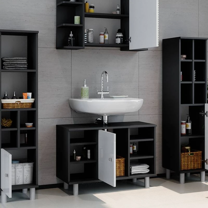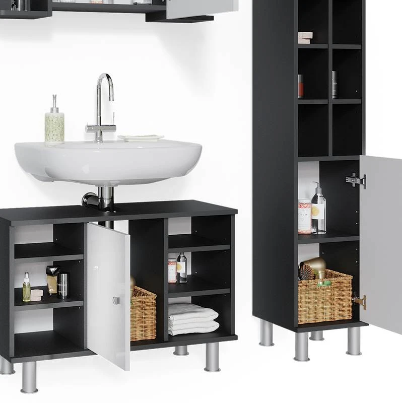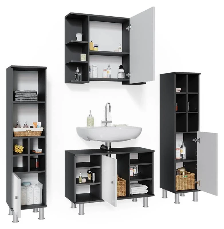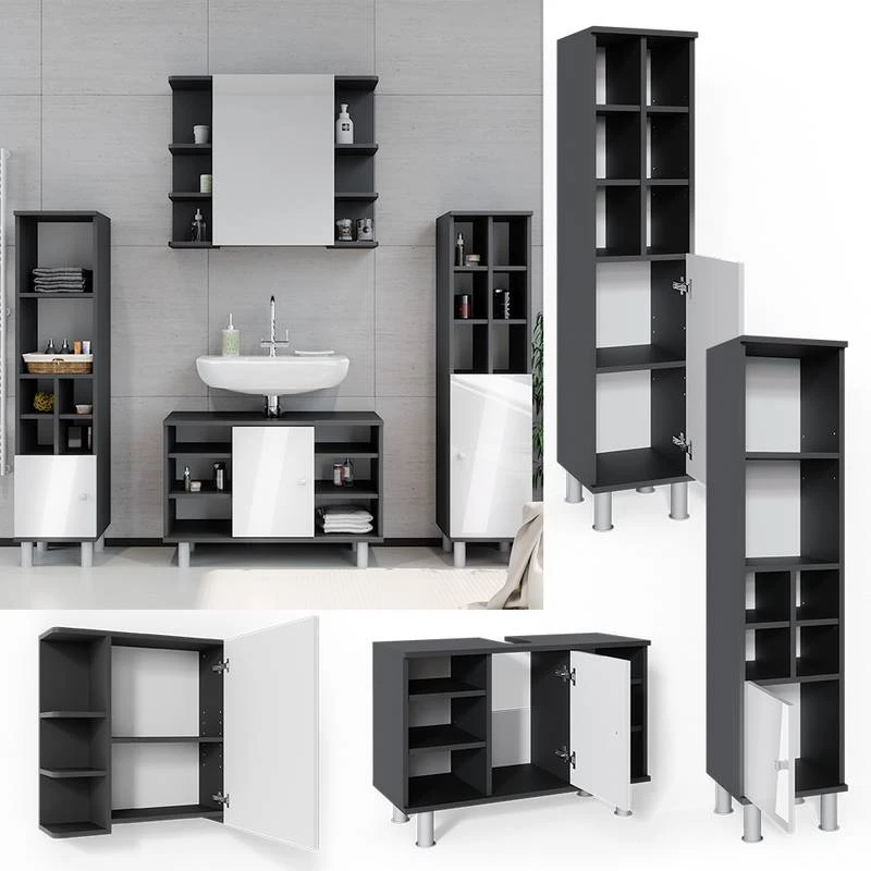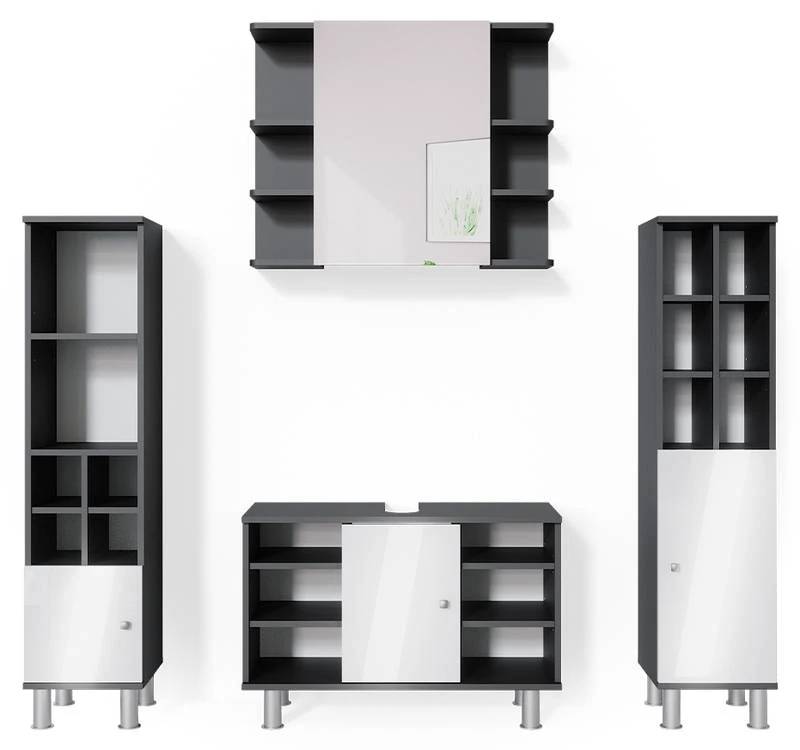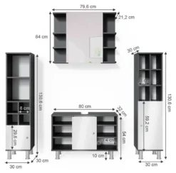 - Contenu de la livraison : • 1x armoire de toilette• 1x meuble sous-vasque• 1x chiffonnier petit• 1x chiffonnier grandDécoration non incluse