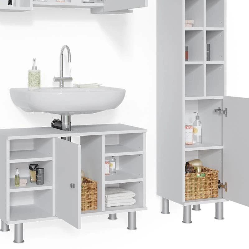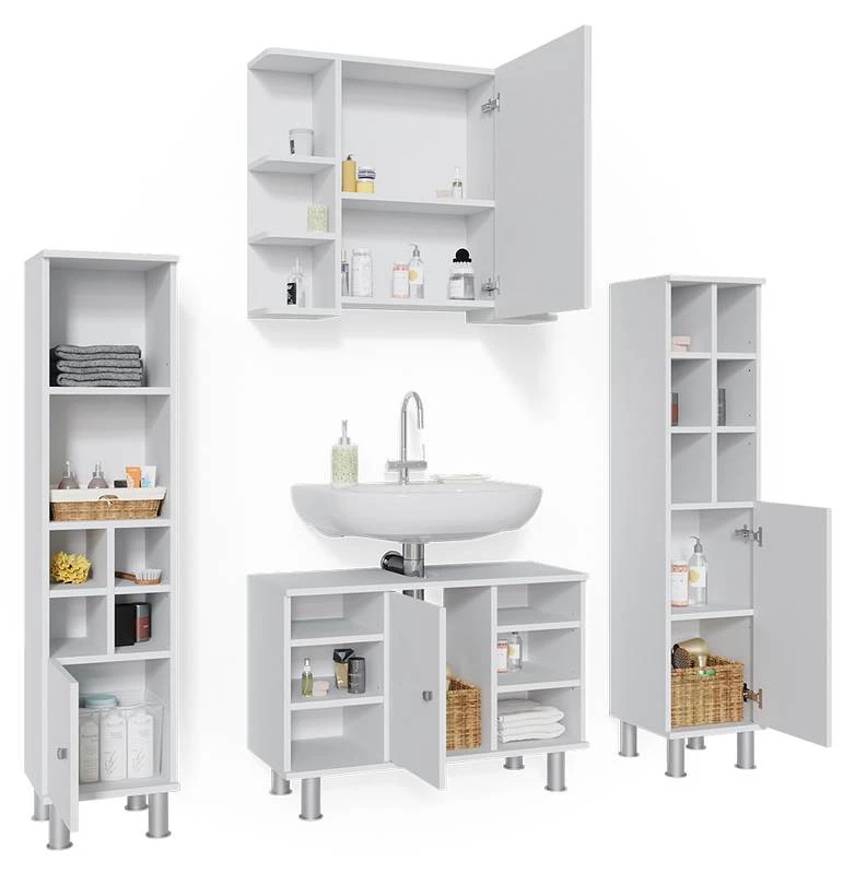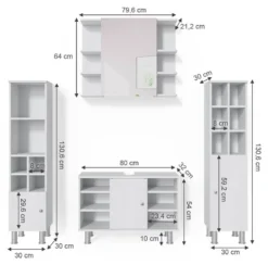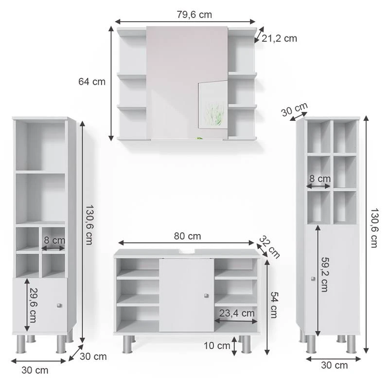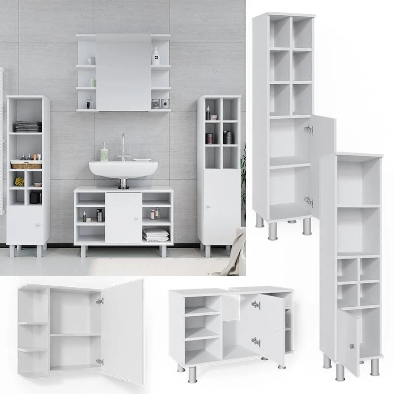 - Contenu de la livraison : • 1x armoire de toilette• 1x meuble sous-vasque• 1x chiffonnier petit• 1x chiffonnier grandDécoration non incluse
