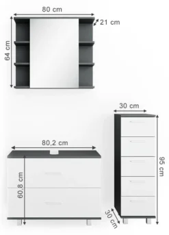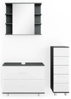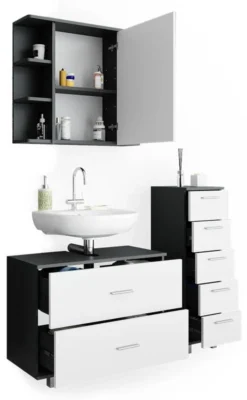- Contenu de la livraison : • 1x armoire de toilette• 1x meuble sous-vasque• 1x chiffonnierDécoration non incluse