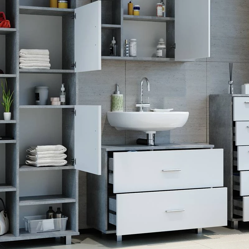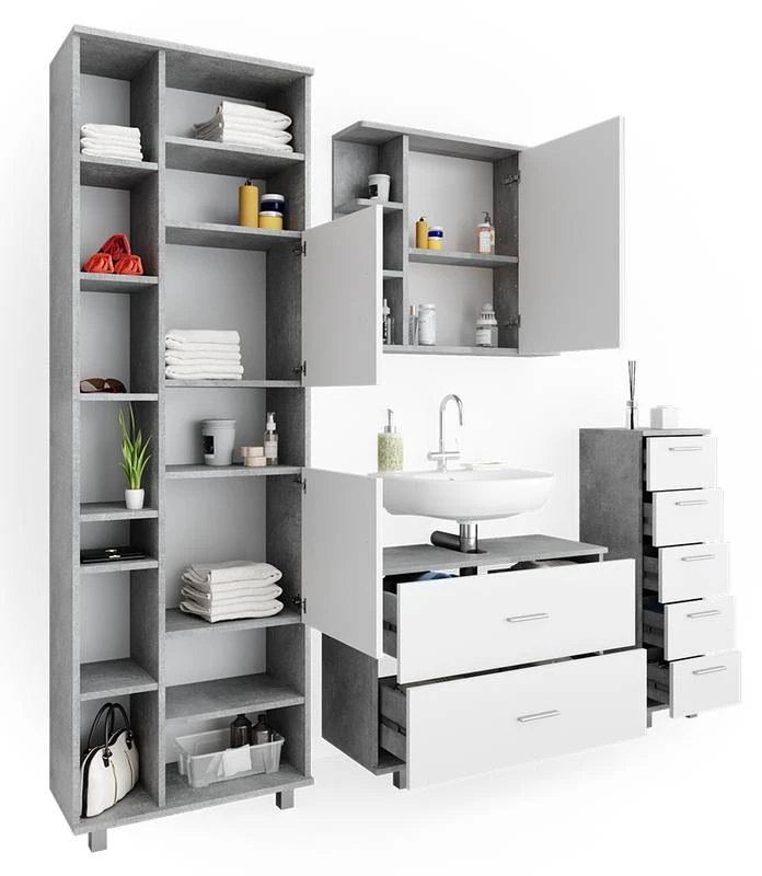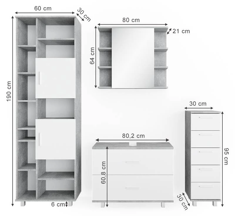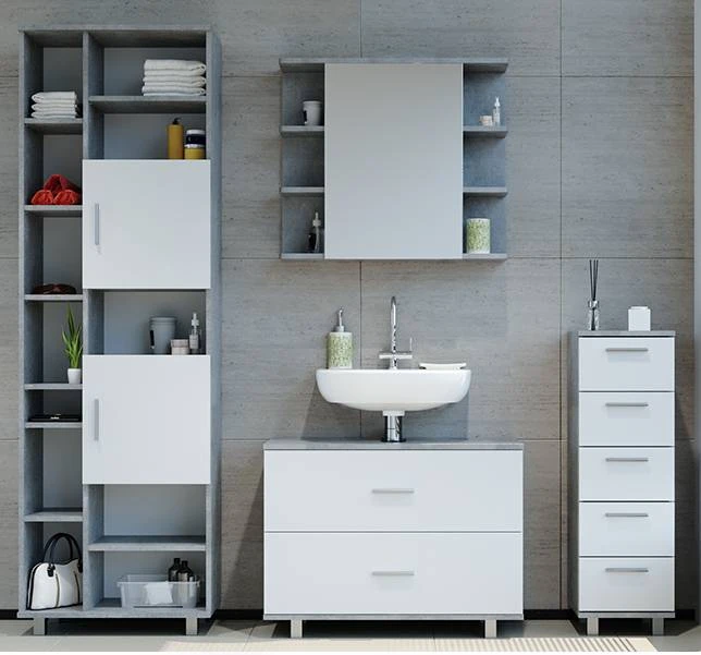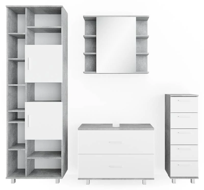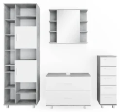 - Contenu de la livraison : • 1x armoire de toilette• 1x meuble sous-vasque• 1x chiffonnier• 1x placardDécoration non incluse